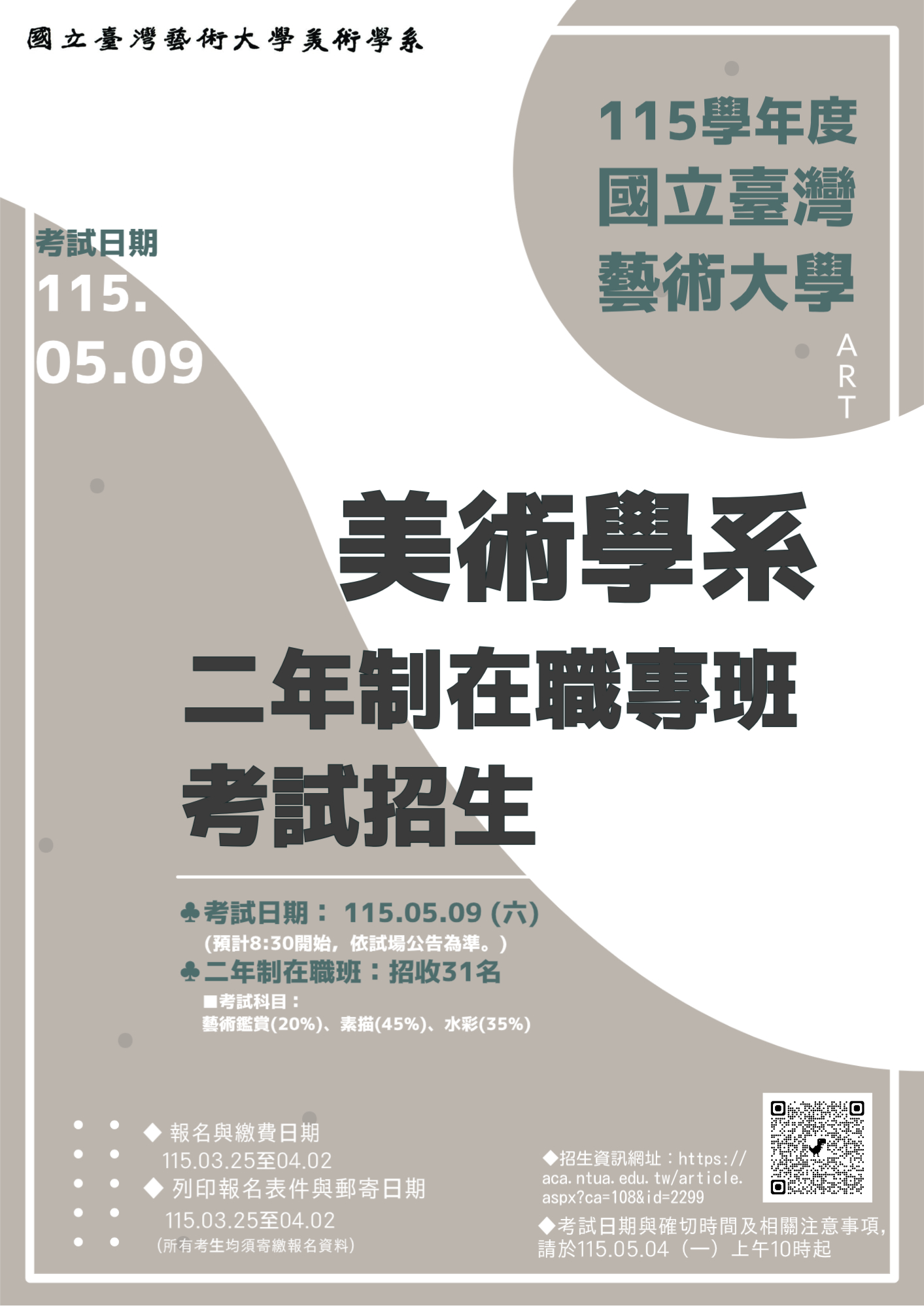 115學年度國立臺灣藝術大學 美術學系二年制在職專班考試招生